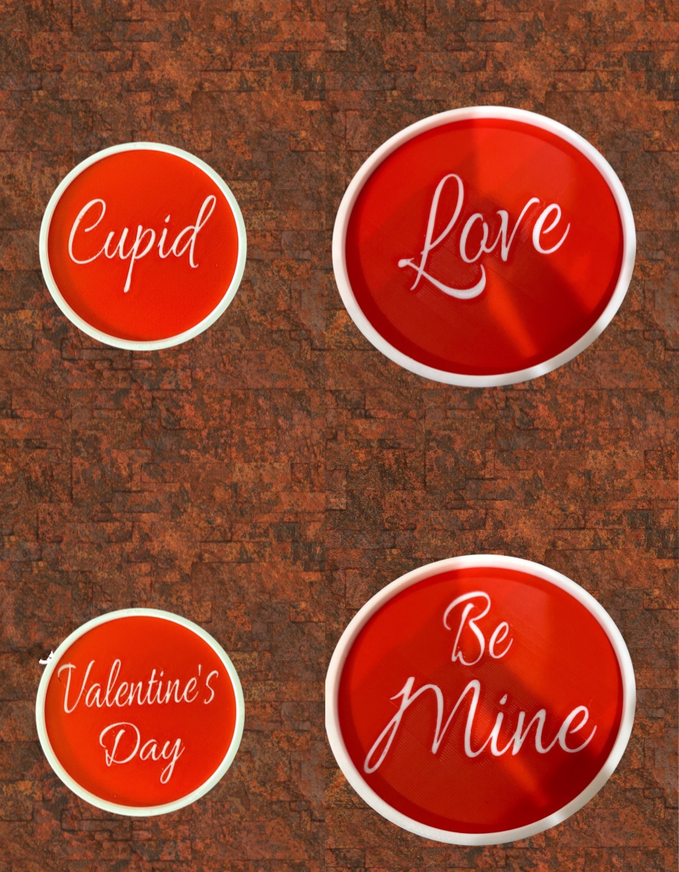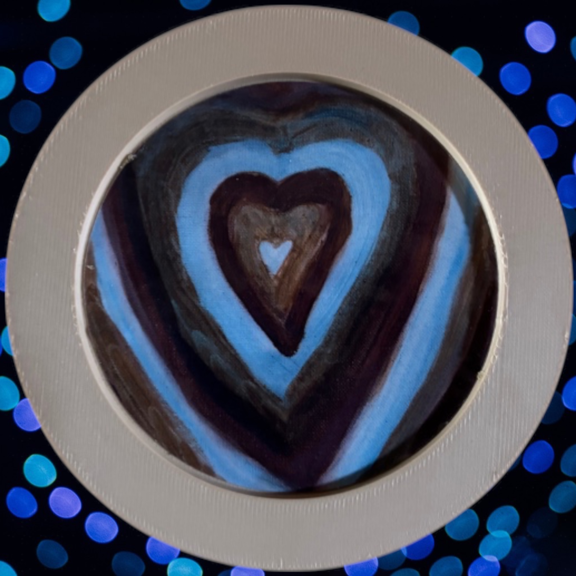 This elegant coaster features hearts enclosed in a pewter-colored rim. The central artwork consists of concentric heart shapes in varying shades of blue, from deep navy to lighter sky blue, creating a layered, nested effect. At the very center is a small, delicate heart with a lighter, almost golden hue. The metallic rim provides a refined border that complements the romantic heart motif, making this coaster both functional and decorative – perfect for adding a touch of love-themed elegance to any table setting.